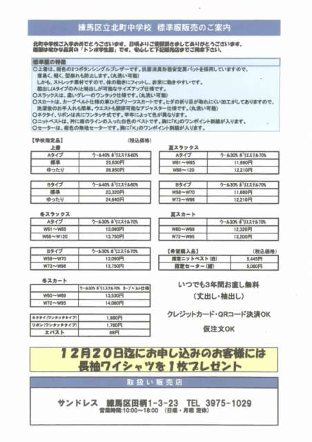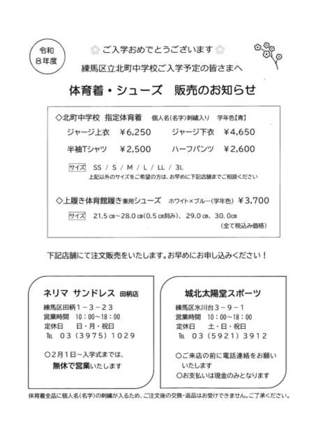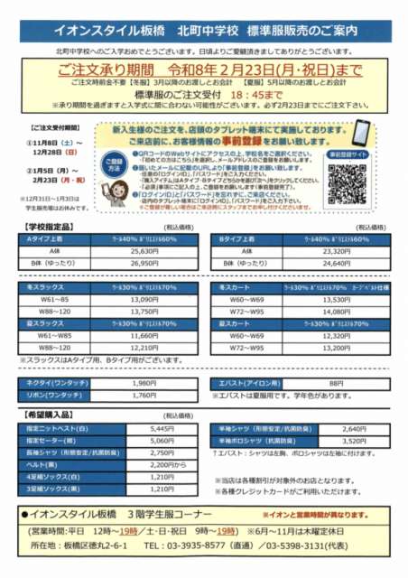 令和7年9月12日(金)の学校説明会でご案内させて頂いた標準服、体育着の販売を下記の取扱店で行います。詳しくは令和8年2月6日(金)の入学説明会でご説明させていただきますが、申し込み締め切り日までお時間が短いので、先にご案内させていただきます。