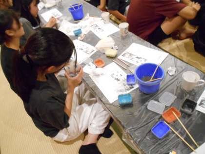 湯呑かマグカップを選び、大部屋で絵付け体験をしました。40分間の真剣な作業でした。焼き上がりが楽しみですね(後日、学校に郵送されます)。