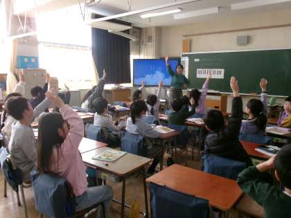 各教室では、○もしくは×を出しながら、楽しくクイズに参加していました。