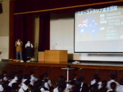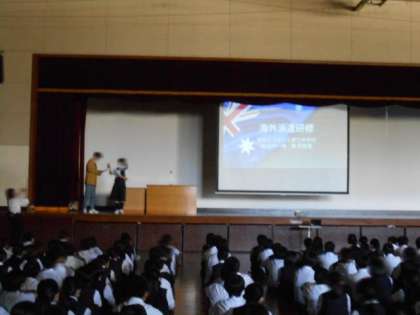 夏休みに5日間オーストラリアへの海外派遣に参加してくれた2名による発表がありました。オーストラリアの特徴、気候、言葉のこと、ホームメイト、交流した現地校、食べ物のことなど、スライドを使って立派に発表してくれました。最初と最後は英語のスピーチを交えて話してくれました。たくさんの経験をつんで、得た物は大きいですね。2人の体験と感動が伝わってきました。この発表を聞いて、来年たくさんの後輩が応募してくれるといいですね。お疲れ様でした。