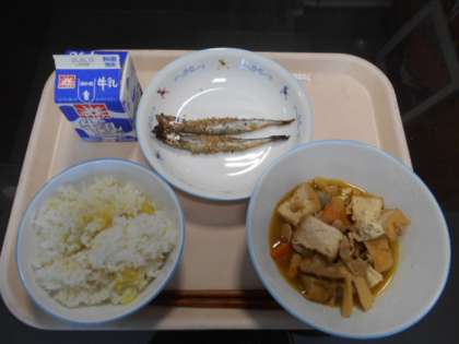 さつまいもご飯、ししゃものピリ辛焼き、生揚げの炊き寄せ、牛乳