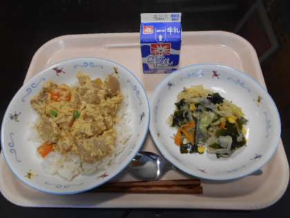 車麩の卵とじ丼(麦ご飯)、じゃことわかめのサラダ、牛乳