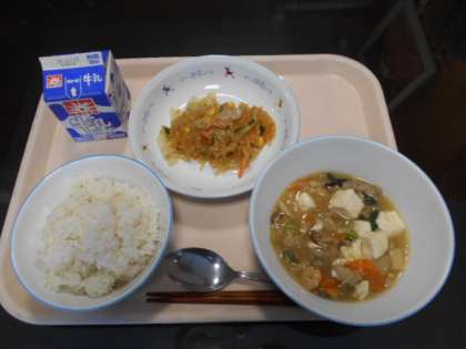 ご飯、いかのチリソース、ひじきとコーンのサラダ、トマトと玉子のスープ、牛乳