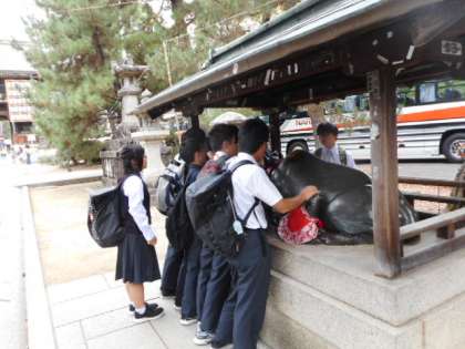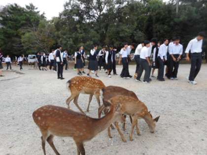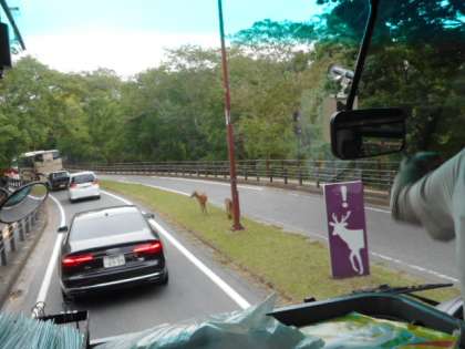 新大阪駅から貸し切りバスで一路、奈良の法隆寺・東大寺へ。途中、鹿の歓迎を受けました。