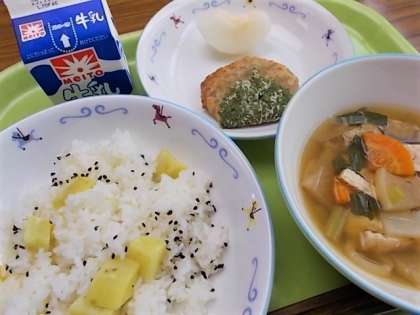 ![]() ![]() ![]() ![]() ![]() ![]() 9月26日(金)の献立![]() ![]() 今日は千葉の郷土料理と特産物を集めた献立です。千葉県では様々な農林水産物を生産しています。特に梨・大根は全国1位、さつまいも・人参・ねぎは全国2位の生産量です。今日はその上位の特産物をたくさん使用しています。 さんが焼きは房総半島の地域周辺で作られた漁師料理です。新鮮な魚にみそや薬味を混ぜ、粘りが出るまで包丁などで細かく叩いた料理『なめろう』を焼き上げたものが『さんが焼き』です。魚だけでは食べ慣れない人もいるので、今日は鶏ひき肉や豆腐を混ぜました。 修学旅行2日目1