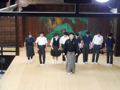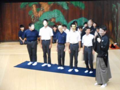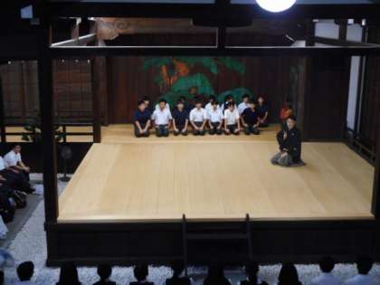 能楽体験をしました。大江能楽堂に入った瞬間、本格的な舞台に感動しました。能の説明があり、みんなで手拍子をして、能のリズムを体感したり、代表者による体験がありました。そして、敦盛の演目を鑑賞しました。