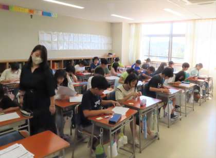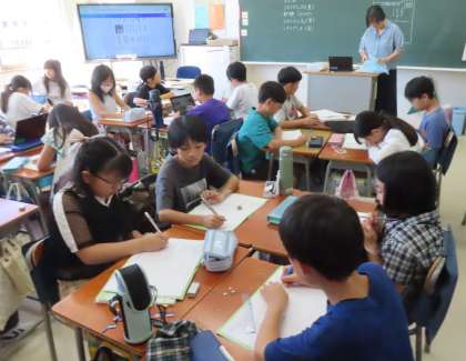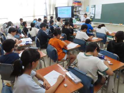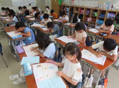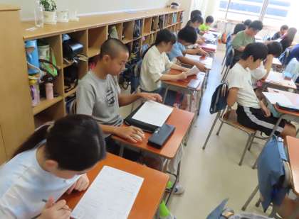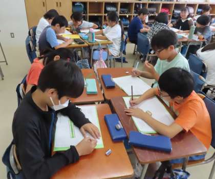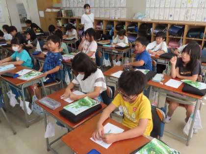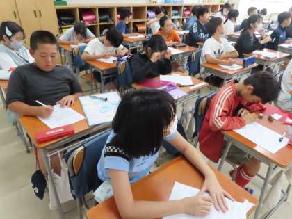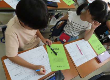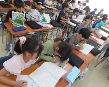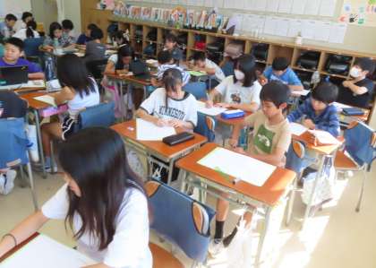 移動教室で学んだこと、感じたことをパンフレットにまとめます。どの感動を読み手に伝えようか、どう工夫しようか、考えています。