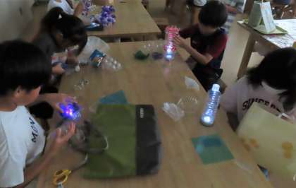 下から光を当てて、セロファンや色を付けたボトルを照らしています。不思議な世界を演出していきます。