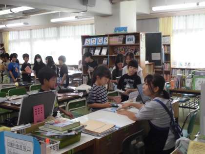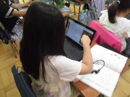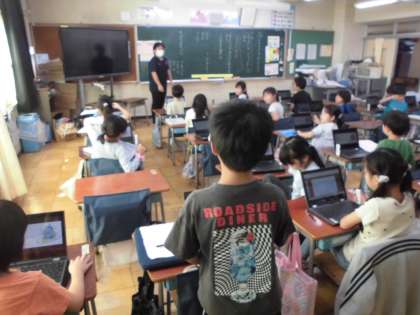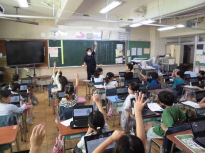今日は1年生がカタカナの学習で、身近なところにあるカタカナの言葉探しを行っていました。教室の中を見回して、使われているカタカナの言葉を書き出し、タブレットを通して共有していきます。1年生でも繰り返していけば、タブレットも使いこなしています。友達が見つけたカタカナの言葉で、いいなと思ったものには「いいね!」のスタンプを付けていきました。楽しく言葉集めをした後は、その言葉を仲間分けし、さらにほかの言葉を考えていきました。どんどん興味をもって、語彙を広げてほしいです。