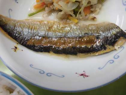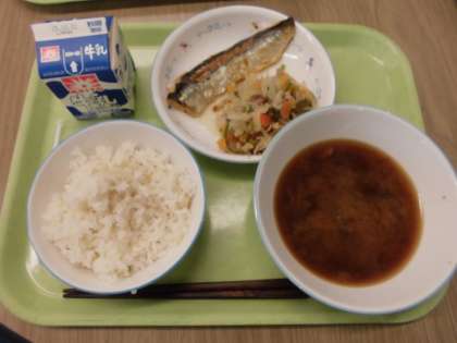 今日のメニューは、ごはん・にしんの塩焼き・野菜炒め・みそ汁・牛乳でした。今日のにしんは脂がたっぷりのっていて、シンプルな塩の味わいとぴったりでした。ご飯が進みましたね。野菜炒めも具だくさんで、こちらもご飯が進みます。みそ汁は、具材が味噌と出汁の旨味を吸い込んでいて、噛みしめると味が口の中に広がりました。こちらもご飯が止まりません。食欲の秋にぴったりでしたね。