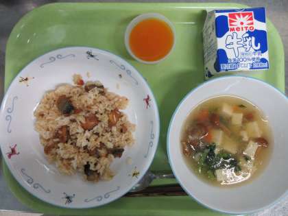 今日の献立は、さんまの混ぜご飯、みぞれ汁、夕焼けゼリー、牛乳です。