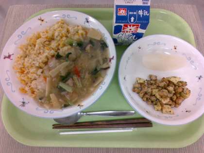 今日の献立は「あんかけチャーハン」「フライドビーンズ(のり塩味)」「梨」です。