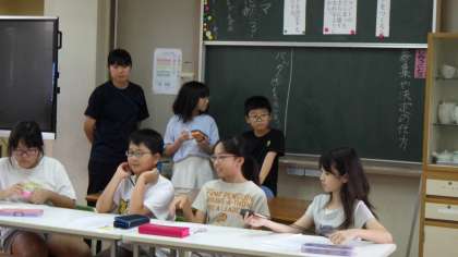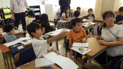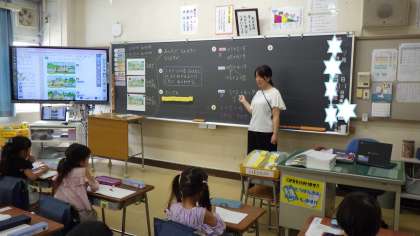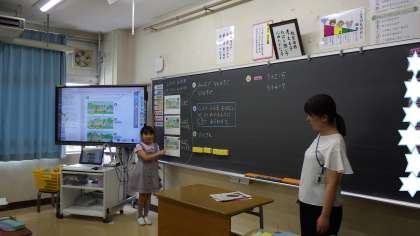 算数科 めあて「ふえて ふえる おはなしが よくわかるように しきにあらわそう」 問題「みんなで なんびきになりますか」 以下のような話の挿絵を提示 「はじめにバスにネコが3びき乗っていました。停留所で2ひき乗ってきました。また、次の停留所で4ひき乗ってきました。」 このお話を式に表すことがねらいでした。 これまでは、3+2=5や5+4=9のような「+」が一回だけの計算(ふえるが1回)だったことと比べながら、お話を式に表していました。 全体で、視覚的に大事なことを抑えた後、一人一人がブロックで操作活動をしたり、式に表したことを説明し合ったりとメリハリのある学習が展開されていました。 ずっと集中して頑張っていた子どもたちですが、30分が経過したところで、少し集中力が切れてきた様子が見られましたが、すかさず教員の的確な声掛けや活動のチェンジ等により、スイッチが入り、最後のまとめ、振り返りまで生き生きと学習していました。 ![]() ![]() ![]() ![]() ![]() ![]() 今日の教員たち 学び変え続ける! 初任者研修