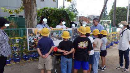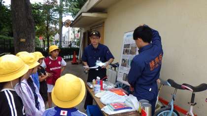 練馬区防災課の方々、避難拠点連絡会の会長の池添様、豊玉小避難拠点に関わってくださっている皆様方が来てくださり、1〜3学年の防災体験学習を行いました。