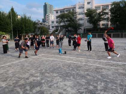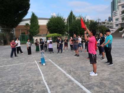先生方も、行事の成功のために頑張っています。徒競走のスタートの仕方やラインのひき方など研修をしています。