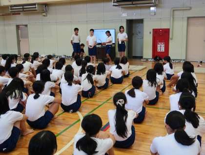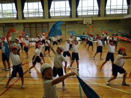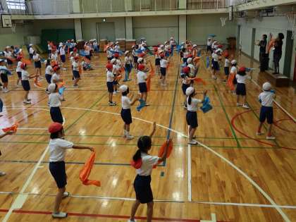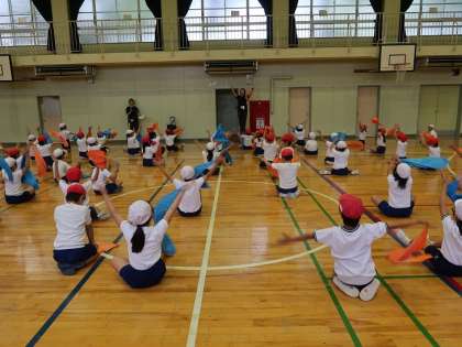 2年生が体育館で大泉スポーツフェスティバルの表現演技の練習をしていました。色とりどりのバンダナを持って演技を行います。どんな演技になるのか楽しみです。