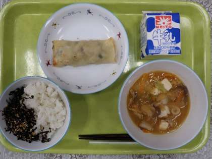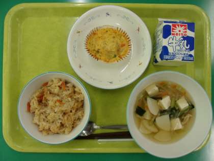 牛乳、こぎつねごはん、中華卵焼き、沢煮椀