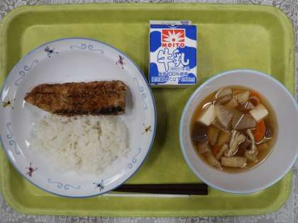 牛乳、七分づきごはん、さんまの蒲焼き、けんちん汁(じゃが芋)
