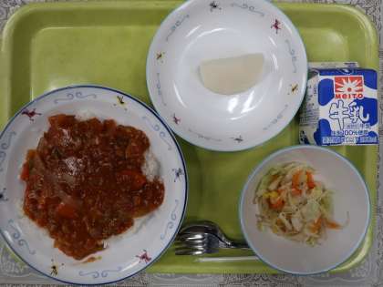 牛乳、ハンガリアンライス、マスタードサラダ、梨