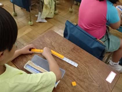 学習のねらいは「三角形や四角形を見つけたり、描いたりすること」です。子供たちは、意欲的に数枚のカードの中からを辺や頂点を意識して三角形・四角形・その他に分類していました。