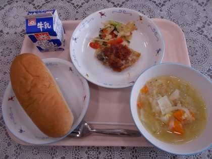 今日の給食は、黒砂糖コッペパン、魚のバーベキューソース、小松菜とベーコンのソテー、レンズ豆のスープ、牛乳でした。