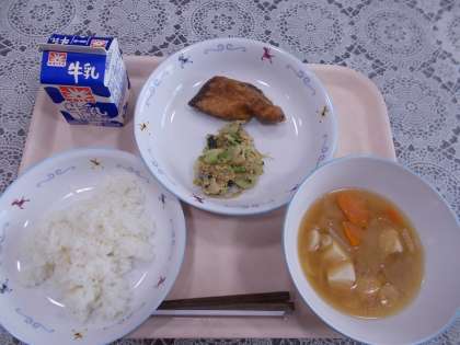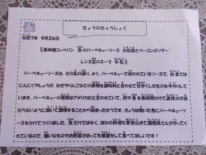 バーベキューソースは、その名の通り、よくバーベキューで使われているソースで、給食ではにんにくやしょうが、ねぎやリンゴなどの果物を調味料と合わせて甘辛くしたものを手作りしています。今日は、焼いた魚にバーベキューソースをかけて作りました。魚の美味しさが増して、とてもいい味がしました!今週も、美味しい給食をありがとうございました!