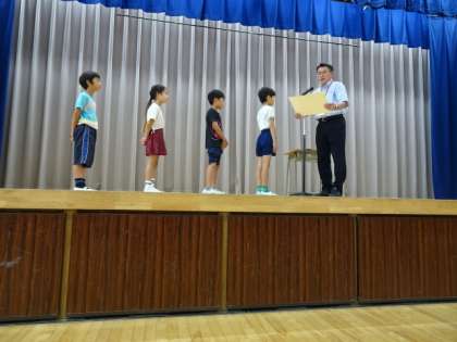 6年生のあいさつの後、私からはあいさつのこと、15周年のことを話しました。その後、2年生消防写生会の表彰をしました。4人の児童が大きな賞状を受け取りました。