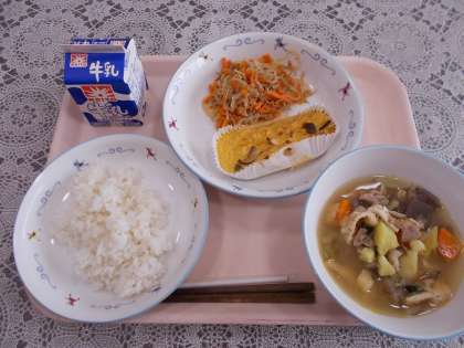 今日の給食は、ごはん、ぎせい豆腐。にんじんとじゃこ炒め、さつま汁、牛乳でした。