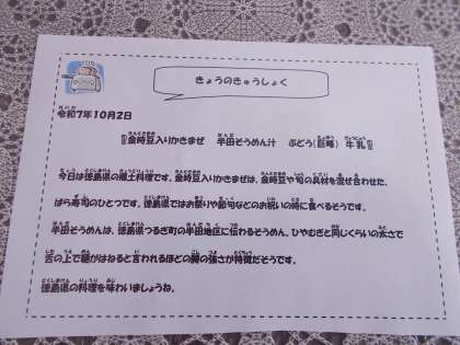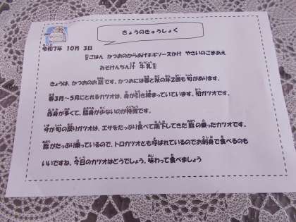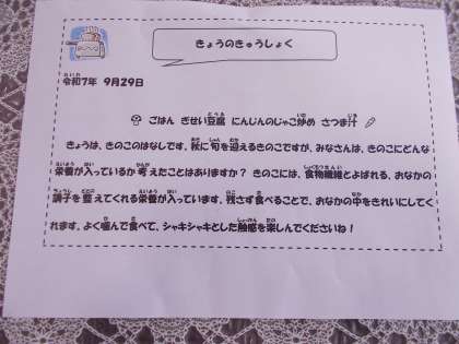 今日は、きのこの話です。秋に旬を迎えるきのこは、食物繊維と呼ばれる、みなさんのお腹の調子を整えてくれる栄養が入っています。残さず食べることで、お腹の中をきれいにしてくれます。シャキシャキとした食感を楽しみながら、さつま汁の中に入っているきのこを美味しくいただきました!