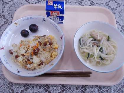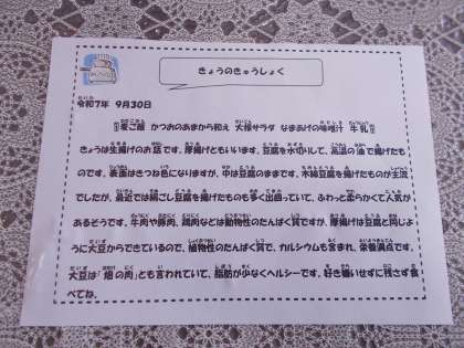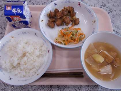 今日の給食は、麦ごはん、かつおのあまから和え、大根サラダ、なまあげの味噌汁、牛乳でした。