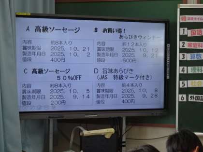 1枚目の写真を見てください。場面設定をしした後に、自分だったらどのソーセージを買うか考えます。子供たちは、値段や品質、数量、安全性などさまざまな観点で商品を選んでいました。