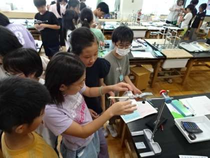 写真は、5年生理科「ふりこのきまり」の学習場面です。