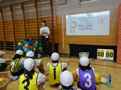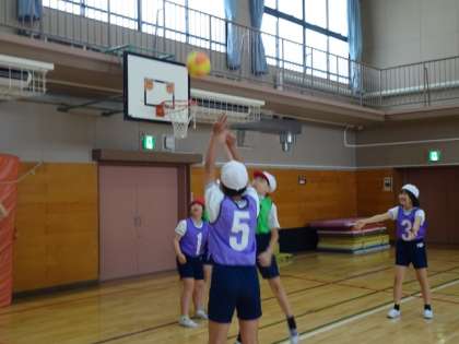 写真は、5年生体育「ボール運動ゴール型」の学習の様子です。