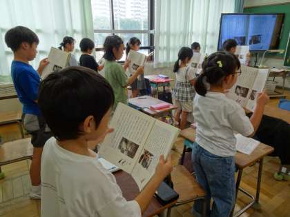今日の学習は、第一場面を叙述に即して丁寧に読み進めていました。この物語文を通して平和の尊さ・戦争の悲惨さを感じてほしいと思いました。