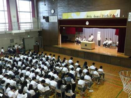 本日は土曜授業です。この機会に、関中学校開校50周年記念講演会を実施しました。椅子をもって体育館に整列です。講師の川島様からは「中学生は可能性しかない!」という力強いメッセージをいただきました。