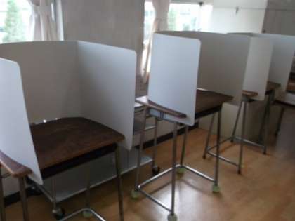 生徒会役員選挙本番です!立候補者と応援演説者は、緊張のなか精一杯自分の主張を述べていました。投票は、投票所を模した一室で、練馬区から借り受けている本物の投票箱を使用しています。投票用紙は本物とはいきませんが、約束事を守り、厳粛な雰囲気を保ちながら投票をしていました。