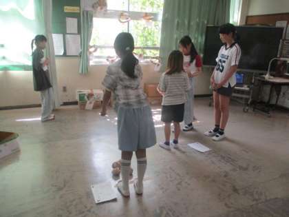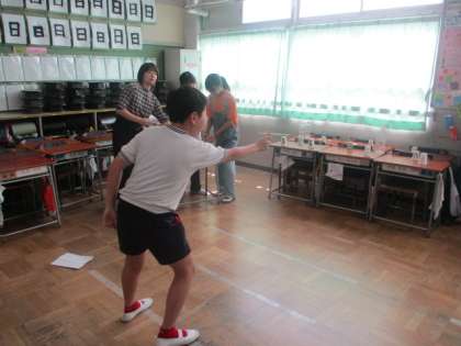 3、4年生がエイサーの練習をしていました。まだ太鼓を使わずに新聞紙のバチと画用紙の太鼓で練習をしていました。太鼓をたたく動作と体の動きをリズミカルに合わせていきます。