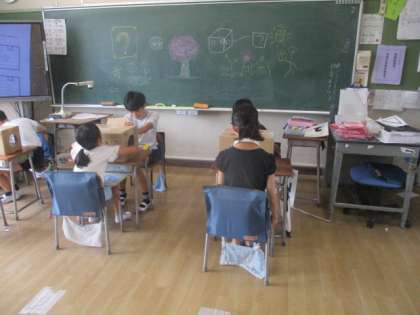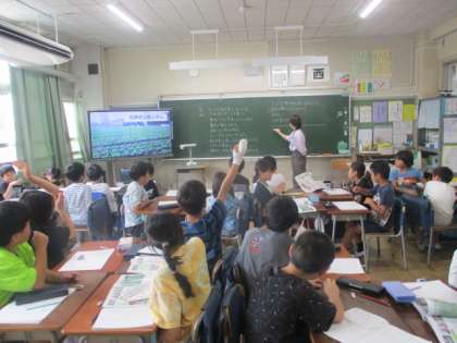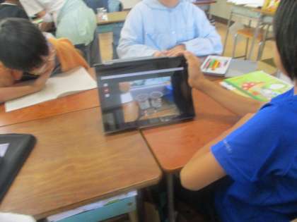4年生は理科「自然の中の水のすがた」を学習していました。水の蒸発は水に戻るのだろうかということを考えていました。もどるという考えが多かったです。冷たい水の周りに水滴がつく観察をして、調べていました。