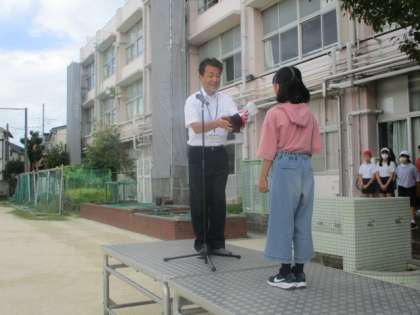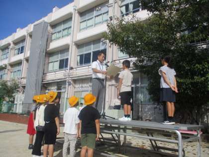 全校朝会で『働く消防写生会』の表彰を行いました。優秀賞2名、入選5名の表彰でした。立派な賞状が届きましたので、全校の前で表彰しました。その前の私の話で「○○の秋」について話をしましたので、芸術の秋として絵に触れることができてよかったです。
