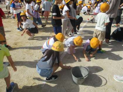 その後、運動会に向けて全校で校庭の石拾いをしました。少しでも怪我がないように校庭整備を行いました。