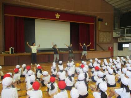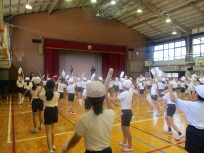 1、2年生が早速、運動会の表現練習をしていました。今日が初めての日ですので、先生たちが前で踊ってみました。子供たちは早くやってみたいという気持ちをもつことができました。
