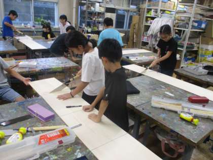 4年生の図工で、木工に挑戦していました。まずは板をのこぎりで切ります。のこぎりの使い方が難しいようで、引くときに切るように声掛けをしました。その後、いくつかの形に切り、創造力を生かしながら組み立てていくそうです。どんな作品ができるか楽しみです。