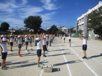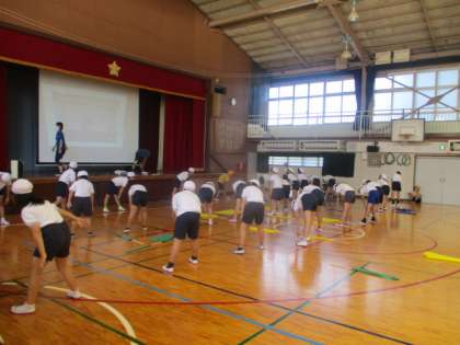 体育集会では、運動会に向けて準備体操と整理体操を練習しました。準備体操はラジオ体操なので、今までに何度も行っています。一つ一つの体の部分をしっかりと動かして、怪我のないようにしていきます。