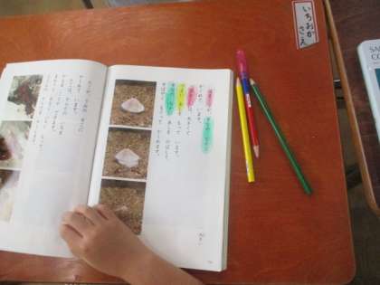1年生が国語「うみのかくれんぼ」の学習をしていました。説明文なので、どんなことが書かれているかをしっかりと読み取ることが必要です。『問い』『答え』を色分けしながら分かりやすく学習していました。