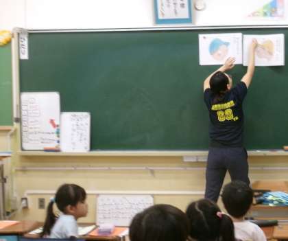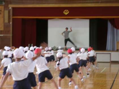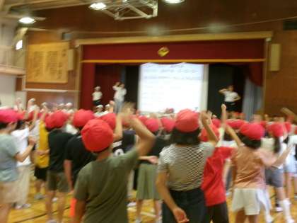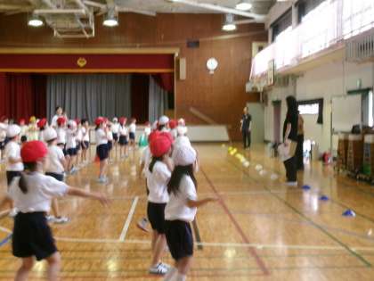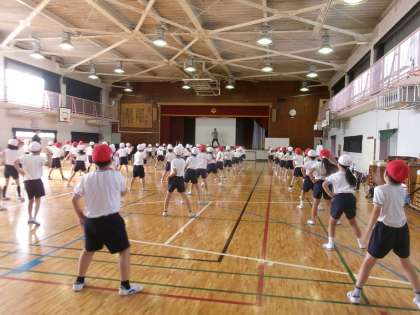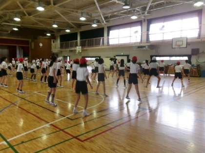 体育館から軽快な音楽が流れてきます。まだ練習を始めたばかりなのに、2年生のみんなが振り付けをしっかり覚えていて驚かされました。お手本の先生の動きと同時に体を動かせているのも、しっかり練習している成果ですね。
