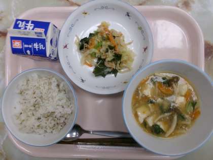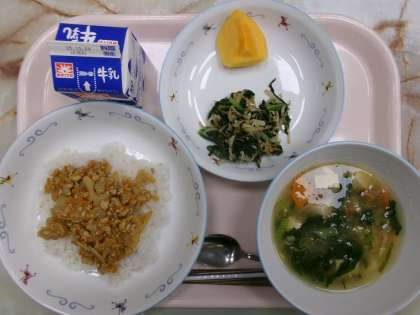 豆腐の中華風煮が美味しくて、ごはんがすすんでしまうメニューです。じゃこに含まれるビタミンDはカルシウムの吸収も助けてくれて、丈夫な体つくりに力を貸してくれます。今日も美味しく食べて、元気に過ごしましょう。