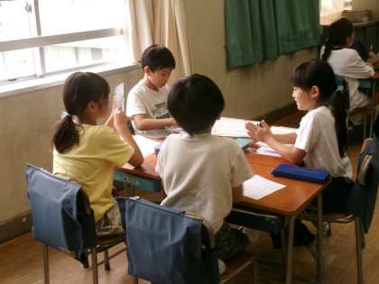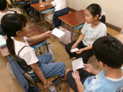 自分の得意なことを見つけられない主人公が、クラスの友達から「本をたくさん読めるってすごいこと」と言われて、自信を深めることができました。そのストーリーを読んで、クラスの友達のすごいと思うことをメッセージカードにしてそれぞれ交換をしました。交換を終えたあと、クラスみんながとても素敵な笑顔になっていました。