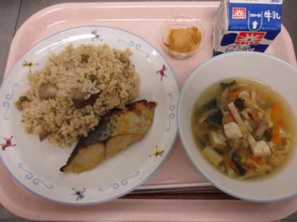 今日の献立は「里芋ご飯・さわらの西京焼き・沢煮碗・お月見団子・牛乳」です。