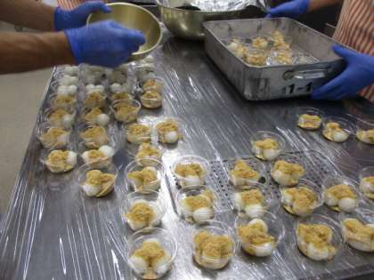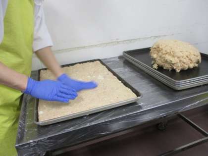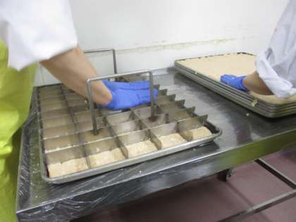 谷原小ではハンバーグの成形が食数の関係で難しいため、鉄板に伸ばしてカットするミートローフの形で提供しています。