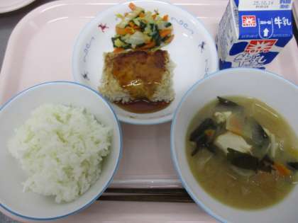 今日の献立は「ごはん・れんこん入りミートローフ・白菜の和え物・厚揚げの味噌汁・牛乳」です。